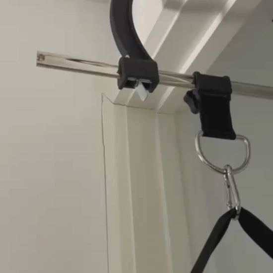 - [Adjustable Width Lock] Features a central locking mechanism to adapt to different door widths and ensure a snug, stable fit during workouts.